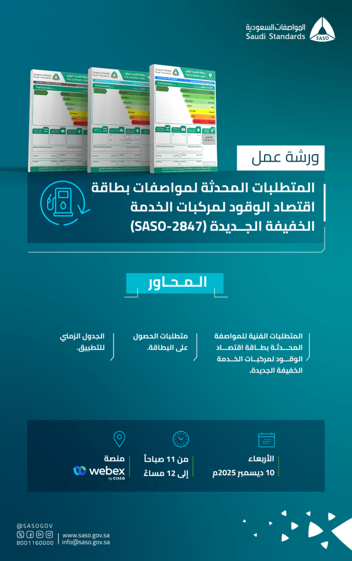 ورشة عمل (المتطلبات المحدثة لمواصفة بطاقة اقتصاد الوقود لمركبات الخدمة الخفيفة الجديدة SASO-2847)