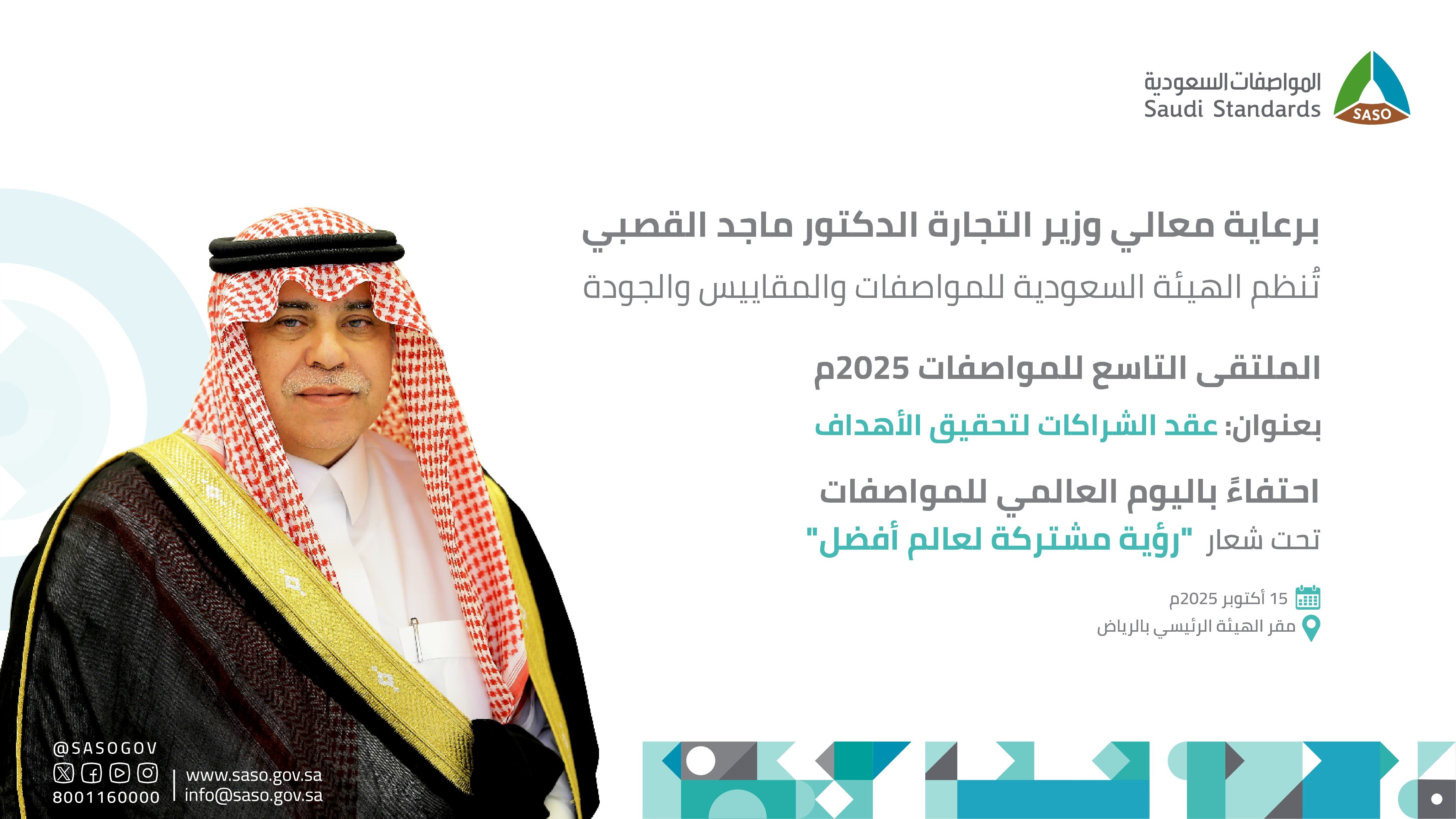 يُذكر أن الملتقى التاسع للمواصفات يأتي تزامنًا مع اليوم العالمي للمواصفات الذي يصادف 14 أكتوبر من كل عام، ويعد ذكرى تأسيس منظمة التقييس الدولية (ISO) في عام 1947م، حيث تحتفل جهات التقييس حول العالم بهذا اليوم لإبراز دور المواصفات القياسية كأداة أساسية لدعم وتعزيز الاستدامة البيئية والاجتماعية في مختلف القطاعات.